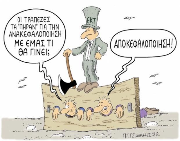 Η ανακεφαλαιοποίηση του τραπεζικού συστήματος έχει καταλάβει σημαντικό μέρος της συζήτησης το τελευταίο διάστημα, γιατί ουσιαστικά αναφέρεται στην προσπάθεια να τεθεί υπό διαχείριση η χρεοκοπία της κορωνίδας του ελληνικού καπιταλισμού, που με τη σειρά της διαδραματίζει ειδικό ρόλο για ολόκληρο το ελληνικό κεφάλαιο. Η ενίσχυση του τραπεζικού συστήματος μέσω της ανακεφαλαιοποίησης μεταφράζεται σε μεταβίβαση «ζεστού χρήματος» 40 έως 45 δισ. ευρώ, τα οποία θα προστεθούν στα 5,5 δισ. ευρώ που είχαν πάρει οι τράπεζες το 2008 επί Αλογοσκούφη – χωρίς να λάβουμε υπόψη τα 145 δισ. που δόθηκαν έμμεσα με τη μορφή «κρατικών εγγυήσεων» για να υποστηρίξουν τη ρευστότητα των τραπεζών.Αυτά τα ποσά βαραίνουν άμεσα το δημόσιο χρέος, δηλαδή τους εργαζομένους και τους συνταξιούχους ουσιαστικά. Η διαδικασία αυτή προχωράει παράλληλα με τη συγκεντροποίηση του τραπεζικού συστήματος, καθώς προβλέπει τη δημιουργία τριών «συστημικών» τραπεζών (όμιλος Εθνικής, Alpha, Πειραιώς) που θα καταλαμβάνουν το 85-90% του τραπεζικού συστήματος. Η μεταφορά κολοσσιαίων ποσών από τα λαϊκά στρώματα στις τράπεζες για τη σωτηρία του κεφαλαίου, και η σκανδαλώδης διαδικασία βάσει της οποίας πραγματοποιείται η μεταφορά αυτή, είναι φυσικό να χρήζει την επιστράτευση όλης της αστικής υποκρισίας για να δικαιολογηθεί.