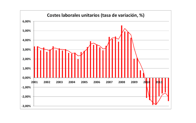 Ο ξεκάθαρος στόχος των μεταρρυθμίσεων αυτών είναι η μείωση του εργατικού κόστους στην Ισπανία ως συμβολή στη διατήρηση σε υψηλά επίπεδα της κερδοφορίας των ισπανικών και άλλων πολυεθνικών που είναι εγκατεστημένες στη χώρα. Ο παρακάτω πίνακας (από το εθνικό πρόγραμμα της Ισπανίας) δείχνει την εξέλιξη του εργατικού κόστους στα πρόσφατα χρόνια: