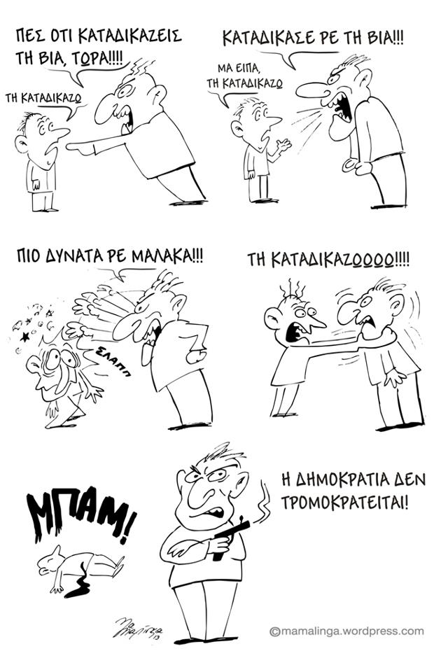 Πρόκειται για την απαίτηση της απόλυτης συναίνεσης πάνω σε αυτό που είπε πρόσφατα ο ακροδεξιός σύμβουλος του Σαμαρά, Φαήλος Κρανιδιώτης: ‘’Σε μια δημοκρατική κοινωνία, η μόνη αποδεκτή βία είναι αυτή που υποχρεώνεται να ασκήσει το κράτος διά των άμεσων οργάνων της εξουσίας εφαρμόζοντας τους νόμους και το Σύνταγμα’’. Να θυμηθούμε βέβαια ότι τα μνημόνια, τα χαράτσια, η περικοπή συντάξεων, η αύξηση τιμής του πετρελαίου, τα ξεπουλήματα δημόσιων επιχειρήσεων, είναι πλέον νόμοι…