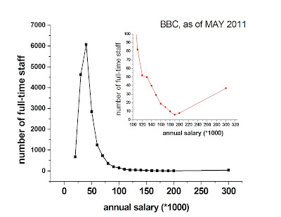 Το διάγραμμα που ακολουθεί δείχνει την κατανομή των υπαλλήλων πλήρους απασχόλησης ανά μισθολογικό κλιμάκιο, όπως ήταν τον Μάιο του 2011. Ο οριζόντιος άξονας δείχνει τον ετήσιο μισθό σε χιλιάδες λίρες, ενώ ο κάθετος τον αριθμό των υπαλλήλων που παίρνουν ένα συγκεκριμένο μισθό. Το ένθετο απλώς, μεγεθύνει τα ανώτερα κλιμάκια, από 100,000 λίρες και πάνω.