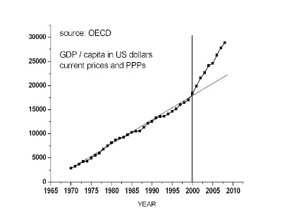 Το πρώτο πράγμα που έρχεται στο νου να εξετάσεις είναι η μεταβολή του ατομικού εισοδήματος από την προ-, στη μετά-ευρώ εποχή, (GDP/capita). Ευτυχώς, ως προς αυτό δεν δυσκολεύτηκα και πολύ. Τα νούμερα, που ξεσήκωσα από τον ιστότοπο του ΟΟΣΑ και τα οποία καλύπτουν την περίοδο 1970-2008, παρουσιάζονται στο παρακάτω γράφημα.