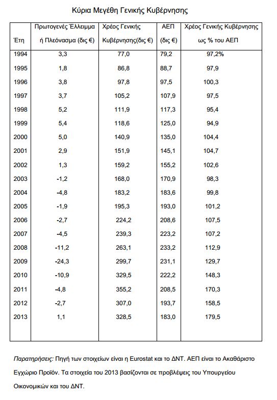 Την περίοδο 1994-2008 η γενική κυβέρνηση για εννέα ημερολογιακά έτη είχε πρωτογενή πλεονάσματα σωρευτικής αξίας 32,4 δις ευρώ. Ωστόσο, το χρέος την ίδια περίοδο εκτινάχτηκε από 77 σε 263,2 δις ευρώ. Σημειώνεται επίσης πως αν και ο μέσος αναπτυξιακός ρυθμός της χώρας ήταν 3,6% σε αυτό το διάστημα, τίποτα δεν εμπόδισε το χρέος- και παρά το πρωτογενές πλεόνασμα- να αυξηθεί 3,42 φορές! (Ελευθεροτυπία 12/5/13: Μύθοι και αλήθειες για το πρωτογενές πλεόνασμα)