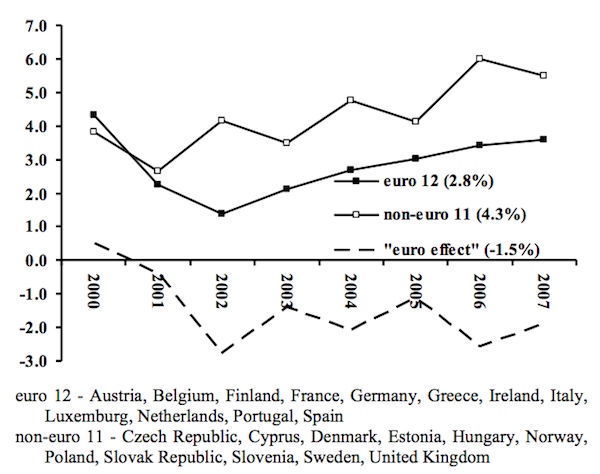 Στα οκτώ αυτά χρόνια (χρυσή εποχή του ευρώ!) οι 12 χώρες της ευρωζώνης είχαν μια μέση ετήσια ανάπτυξη 2,8%, ενώ οι 11 χώρες εκτός ευρωζώνης ένα μεγαλύτερο μέσο ετήσιο ρυθμό 4,3% (ή 53% υψηλότερο ρυθμό). Η μέση διαφορά στη ανάπτυξη ήταν 1,5%, η οποία μάλιστα μετά το 2002 είχε σχεδόν σταθεροποιηθεί στο 2%.