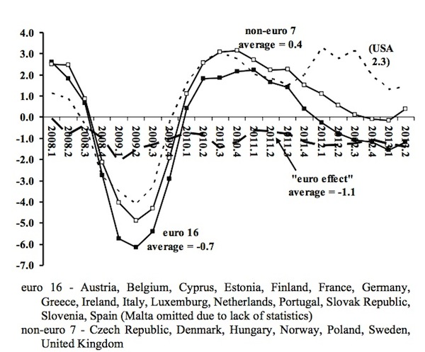 Από το πρώτο τρίμηνο του 2008 έως το δεύτερο τρίμηνο του 2013, σε ένα διάστημα πέντε χρόνων, οι 16 χώρες της ευρωζώνης (Αυστρία, Βέλγιο, Κύπρος, Φινλανδία, Εσθονία, Γαλλία, Γερμανία, Ελλάδα, Ιρλανδία, Ιταλία, Λουξεμβούργο, Ολλανδία, Πορτογαλία, Σλοβακία, Σλοβενία, Ισπανία), είχαν ένα μέσο ετήσιο αρνητικό ρυθμό ανάπτυξης 0.7%. Στην ίδια περίοδο η ομάδα 7 χωρών εκτός ευρωζώνης (Τσεχία, Δανία, Ουγγαρία, Νορβηγία, Πολωνία, Σουηδία, Μεγάλη Βρετανία), είχαν μέσο ετήσιο θετικό ρυθμό ανάπτυξης 0,4%. Η διαφορά σε βάρος του ευρώ είναι 0.7+0.4=1,1%.