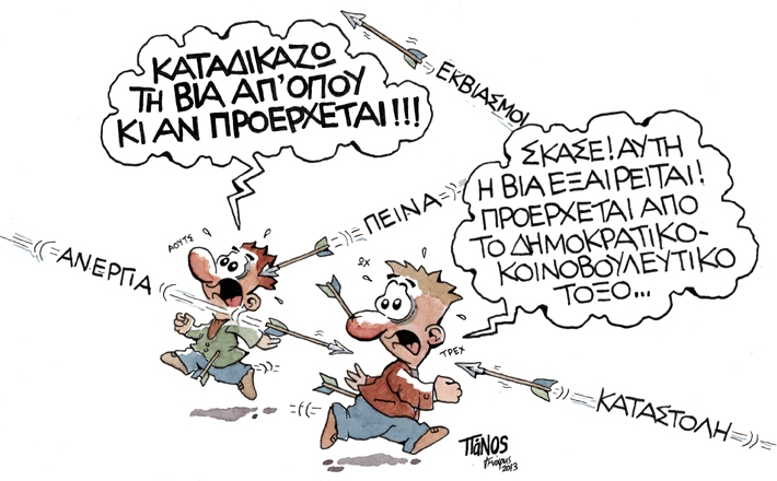 Να ζητήσουμε «συγγνώμη», για παράδειγμα, για λογαριασμό του Άρη και του αντάρτη του ΕΛΑΣ που άσκησαν βία κατά της χιτλερικής χολέρας. «Συγγνώμη» για λογαριασμό του Καραϊσκάκη και του Κολοκοτρώνη. «Συγγνώμη» για λογαριασμό του στρατιώτη του Κόκκινου Στρατού που τσάκισε το κτήνος του ναζισμού στο Ράιχσταγκ. «Συγγνώμη» για λογαριασμό των κολίγων στο Κιλελέρ. Συγγνώμη για λογαριασμό εκείνων που γκρέμισαν τη Βαστίλη και των άλλων που πολέμησαν για την κατάργηση της δουλείας στην Αμερική. «Συγγνώμη» για λογαριασμό και του πιτσιρικά της «Ιντιφάντα» που πετούσε τόσο βίαια τις πέτρες του στα τανκς των Ισραηλινών. «Συγγνώμη» και για την άποψή μας ότι ο λαός μας, οργανωμένα, αποφασιστικά και μαζικά – δηλαδή δημοκρατικά – έχει κάθε δικαίωμα να πάρει την «όψη που με βιά μετράει τη γη» και να αποτινάξει από το σβέρκο του τα μνημόνια και ό,τι γεννάει τα μνημόνια.