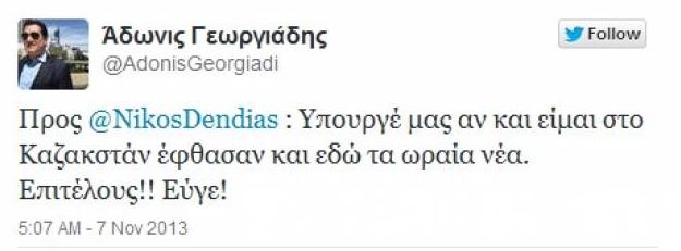 Πρόκειται για την ανάρτηση στο twitter του τηλε-βιβλιοπώλη και Υπουργού Υγείας του Σαμαρά, Άδωνη Γεωργιάδη και απευθύνεται στον Υπουργό Δημόσιας Τάξης Νίκο Δένδια.