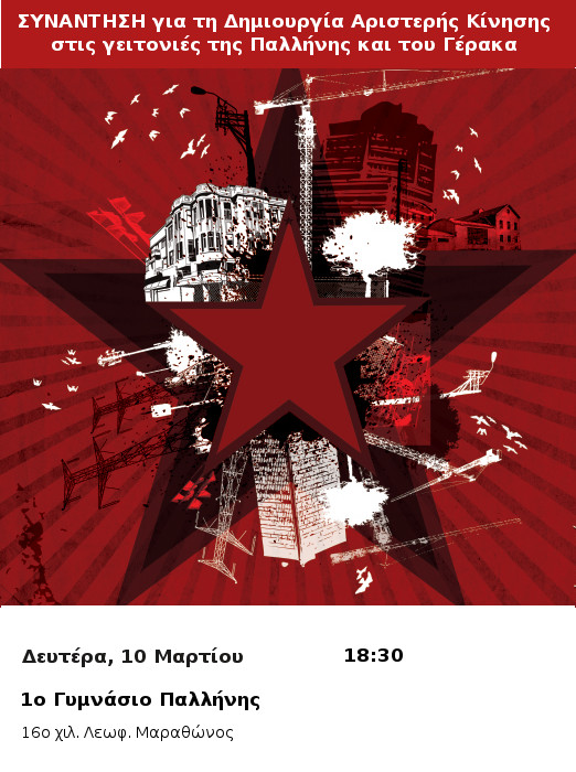 Σήμερα, είναι αναγκαίο όλοι οι κάτοικοι της Παλλήνης, του Γέρακα και της Ανθούσας που συνειδητοποιούν όχι μόνο ότι «δεν πάει άλλο» αλλά ότι μπορεί και πρέπει «να πάει αλλιώς», όλοι όσοι θέλουν να αγωνιστούν για τα εργατικά και λαϊκά δικαιώματα ενάντια στο μαύρο μέτωπο κυβέρνησης – δημοτικών αρχών – ΕΕ – ΔΝΤ, όσοι θεωρούν ότι ο κόσμος μας δεν είναι για πούλημα στο μεγάλο κεφάλαιο και τα μονοπώλια, όσοι συναντήθηκαν στους δρόμους και τις πλατείες του αγώνα ενάντια στα μνημόνια, στην τρόικα, κι εδώ στη γειτονιά ενάντια στα χαράτσια, στην έλλειψη ή/και υποβάθμιση των δημόσιων χώρων, στη συρρίκνωση των σχολείων, τη φασιστική απειλή, όσοι συναντιούνται και αναζητούν μια άλλη λεύτερη πολιτιστική δημιουργία που να αναδεικνύει τη δημιουργικότητα και την περηφάνια του κόσμου της δουλειάς, να κάνουμε ένα βήμα μπροστά και να διαμορφώσουμε μια μόνιμη τοπική πολιτική – δημοτική πρωτοβουλία/κίνηση, παρούσα σε όλες τις κοινωνικές και πολιτικές μάχες.