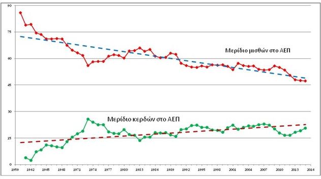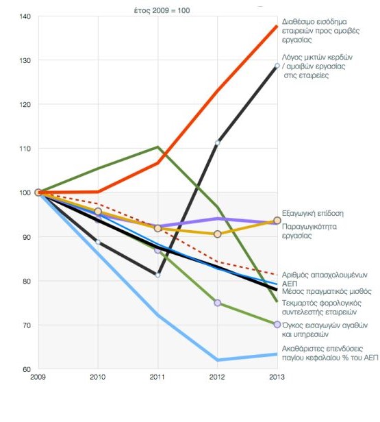 Στο ίδιο διάστημα, στην αντίπερα κοινωνική όχθη, η κίνηση είναι αντίθετη. Έτσι, το διαθέσιμο εισόδημα των εταιρειών υπολογισμένο μετά τους φόρους επί των κερδών και της περιουσίας, ως προς τις αμοιβές εργασίες, αυξήθηκε κατά 38%. Επίσης ο λόγος μικτών κερδών ως προς τις αμοιβές εργασίας στις εταιρείες, αυξήθηκε κατά 29% την ίδια περίοδο. (Στοιχεία από Ηλίας Ιωακείμογλου και Λευτέρης Τσουλφίδης)