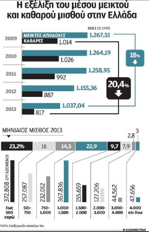3. Οι μέσες αποδοχές των εργαζομένων από 1.267 ευρώ στο τέλος του 2009 έπεσαν στο τέλος του 2013 στα 1.037 ευρώ. Οι καθαρές αποδοχές υποχώρησαν από τα 1.014 στα 817 ευρώ.