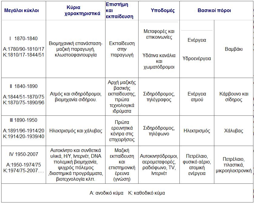 Στον πίνακα που ακολουθεί παρουσιάζονται οι τέσσερις μεγάλοι κύκλοι και οι μεταβολές που συντελέστηκαν στην παγκόσμια οικονομία.