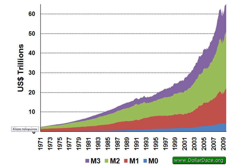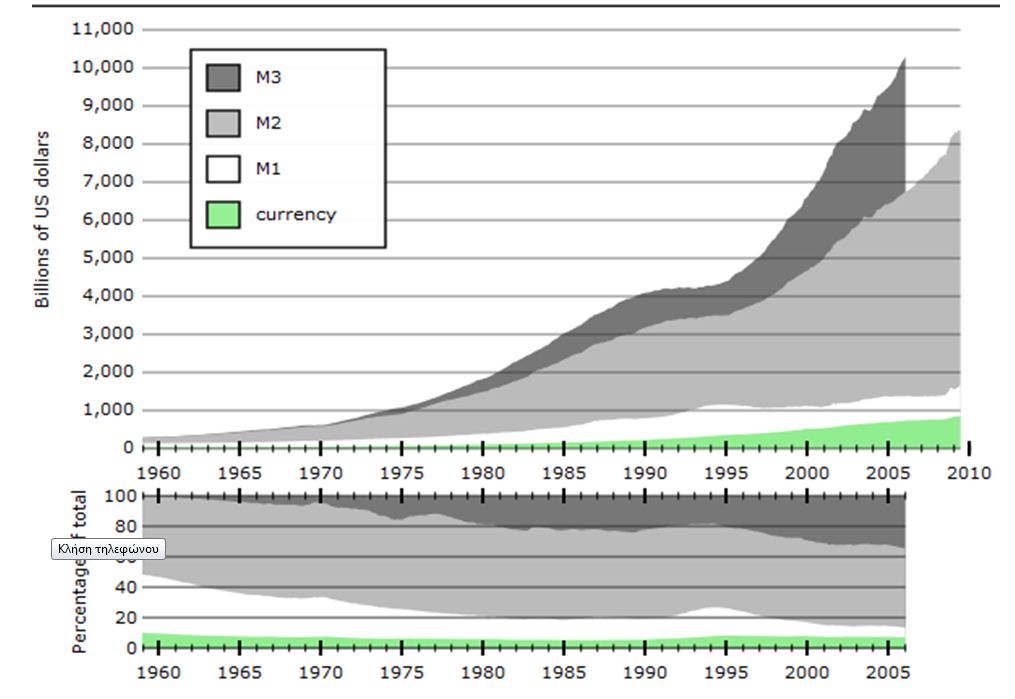 Στο παραπάνω διάγραμμα παρατηρούμε την αύξηση όλων των μορφών χρήματος από το 1971 και μετά, και την κατακόρυφη άνοδό του από το 2000 και μετά.