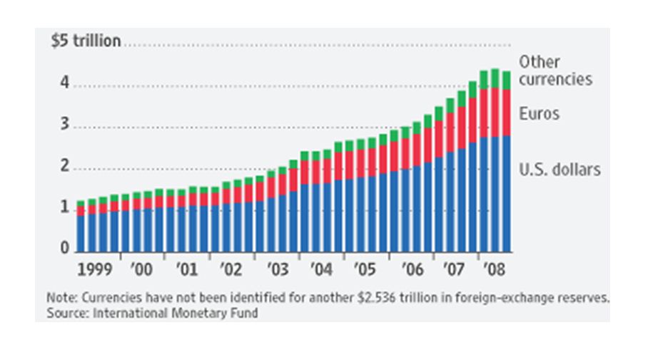 Παρατηρούμε αρχικά τη μεγάλη άνοδο των παγκόσμιων αποθεματικών μέσα στην πρώτη δεκαετία του εικοστού πρώτου αιώνα από 1,2 τρισεκατομμύρια δολάρια το 1999 σε 4,5 σχεδόν τρισεκατομμύρια δολάρια το 2009. Τα παγκόσμια αποθεματικά κυριαρχούνται από το δολάριο σε ποσοστό 60% περίπου με τη δεύτερη θέση να την κατέχει το ευρώ με ποσοστό 25% περίπου. Από τις αρχές του εικοστού αιώνα, οπότε και κυκλοφόρησε το ευρώ, παρατηρούμε μια συνεχή μείωση του ποσοστού των αποθεματικών σε δολάρια και μια αντίστοιχη αύξηση των αποθεματικών σε ευρώ.
