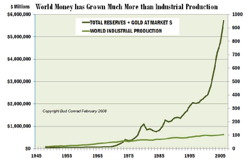 Στο ιδιαίτερα ενδιαφέρον παραπάνω διάγραμμα βλέπουμε την απόλυτη αναντιστοιχία μεταξύ του χρήματος που βρισκόταν σε παγκόσμια κυκλοφορία και της πραγματικής παραγωγής, μετά τα μέσα της δεκαετίας του 1970 και ιδιαίτερα μετά το 2000. Μια μεγάλη ανατροπή συντελέστηκε επομένως από τα μέσα της δεκαετίες του 1970. Το χρήμα δεν αποδεσμεύτηκε μόνο από το χρυσό ή τον άργυρο αλλά και από την παραγωγή, αποτελώντας πλέον ένα τελείως ιδιόμορφο εμπόρευμα.