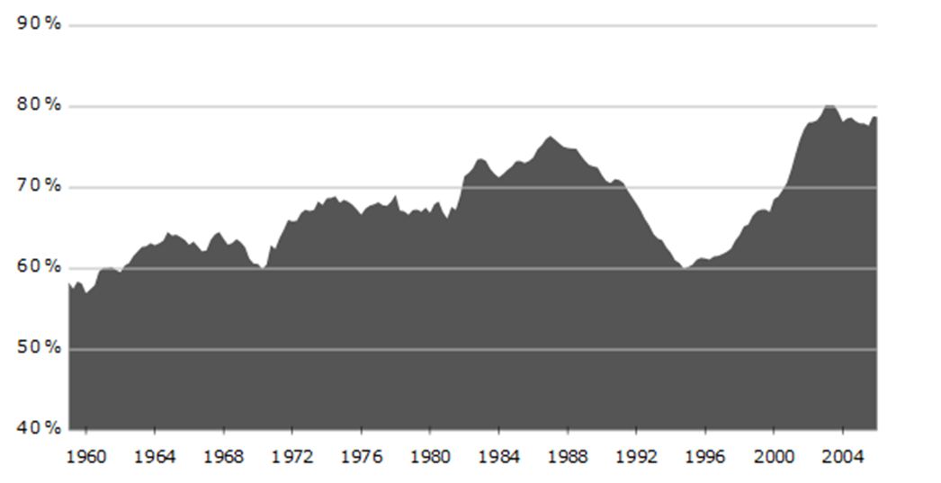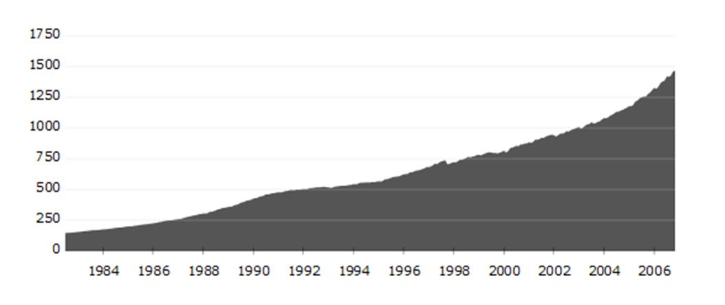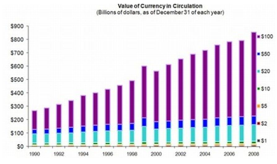 Σε αντιδιαστολή με το παραπάνω διάγραμμα βλέπουμε στο επόμενο διάγραμμα το χρήμα που βρισκόταν σε κυκλοφορία και την ομαλή αύξησή του από το 1990 ως το 2008.