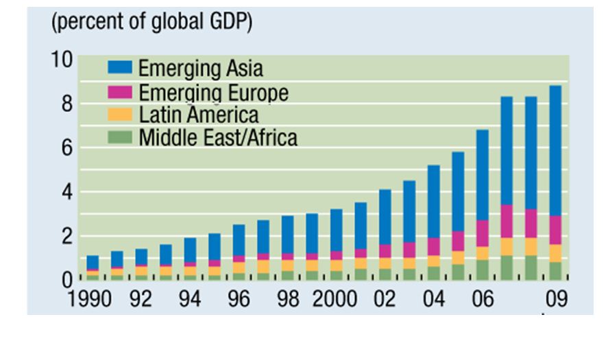 Στο τελευταίο διάγραμμα παρουσιάζουμε τα αποθεματικά των ανερχόμενων αγορών, σαν ποσοστό του παγκόσμιου ΑΕΠ, από το 1990 ως το 2009 όπως έχουν υπολογιστεί από το Διεθνές Νομισματικό Ταμείο. Παρατηρούμε τη ραγδαία άνοδο των αποθεματικών ιδιαίτερα των χωρών της Ασίας.