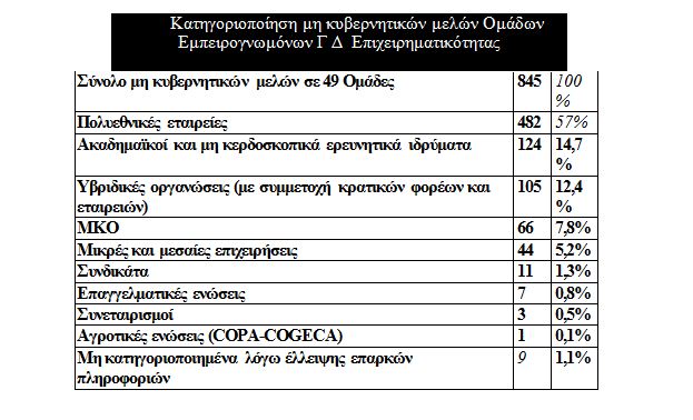 Σε επίπεδο ομάδων, οι πολυεθνικές επικρατούν σε 32 (ή το 65%), οι ακαδημαϊκοί σε οκτώ, οι υβριδικές οργανώσεις σε δύο, οι μεσαίες επιχειρήσεις σε μία, ενώ μόλις έξι έχουν εξισορροπημένη σύνθεση.